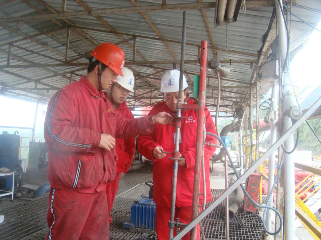 元陆11井钻井监督张兴宇(右一)在旁站检查液面自动报警仪灵敏度